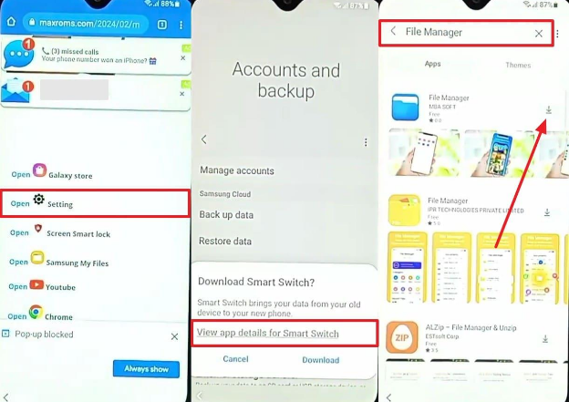 Step 2. Opt for “Maxroms Google Bypass > Settings > Samsung Account” and sign in to your account. After that, head to “Accounts and Backup > Bring Data From Old Device > View App Details For Smart Switch.” As you access, tap the “Search” icon to open “File Manager” and install it. Then search for and install the “App Launcher” app.