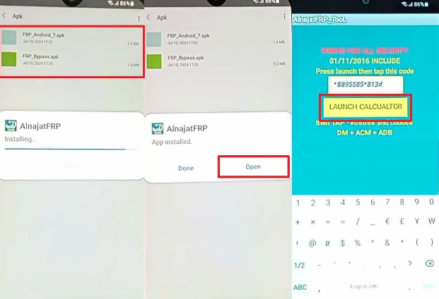 Step 4. Open the “File Manager” app to tap “Install > Accept > Allow > Allow Access to All Files > APK.” Afterward, install both downloaded APK files to your phone. Once “FRP_Android_7.apk” is installed, tap “Open > Continue” and type code like “*$895585*813#.” Then, hit the “Launch Calculator” button around 10 to 20 times until your phone powers off. Once it is powered on after a few seconds, you will bypass FRP and the Google verification process.
