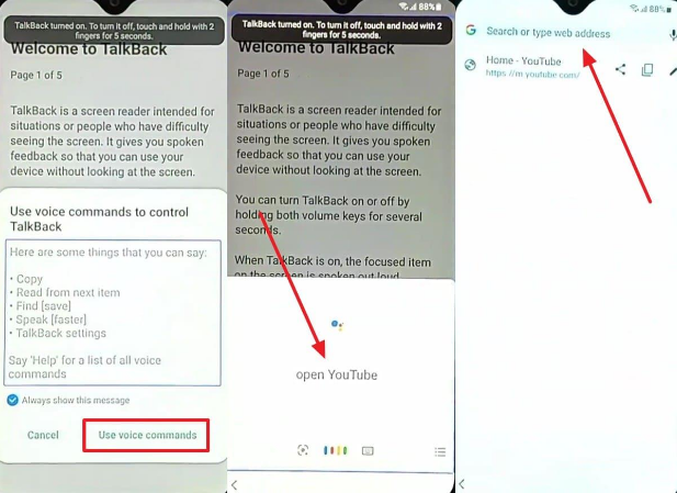 Step 1. While setting up your phone, connect it to your Wi-Fi and revert to the welcoming screen. Tap your 2 fingers on the screen for a few seconds to access “TalkBack.” Swipe right or as per the displayed prompt to choose “Use Voice Command > Speak Google Assistant> Open YouTube.” Press “Agree and Continue > No Thanks > Web Link” and type “maxroms.com.”