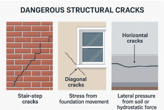 Pay close attention to horizontal cracks in foundations or basement walls. These usually mean outside soil and water pressure is pushing the wall inward. If a crack is wider than 1/8 inch, keeps getting larger, or the two sides of the crack no longer line up, it has moved beyond a minor cosmetic flaw and needs a professional to check it right away.